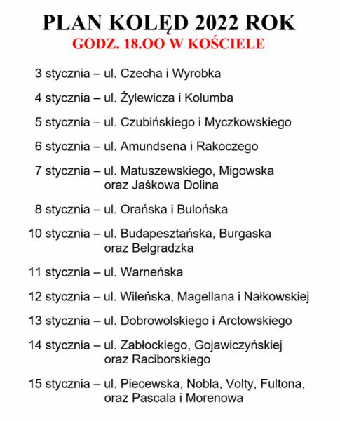 Zapraszamy więc mieszkańców naszej parafii na Eucharystię, według poniższego schematu, między 3 a 15 stycznia o godzinie 18:00.