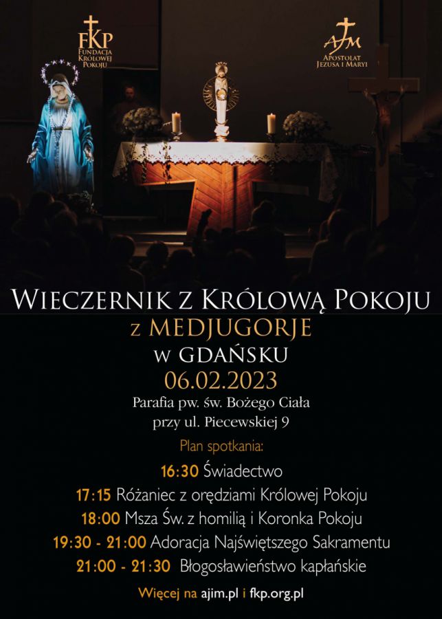 Razem z Apostolatem Jezusa i Maryi i Fundacją Królowej Pokoju zapraszamy na Wieczernik z Królową Pokoju, który odbędzie się w naszym kościele w poniedziałek, 6-tego lutego br. Nasza parafia została wybrana jako jedyna w Trójmieście w ramach ogólnopolskiej trasy Wieczerników, które odbędą się w 20 największych miastach w Polsce.